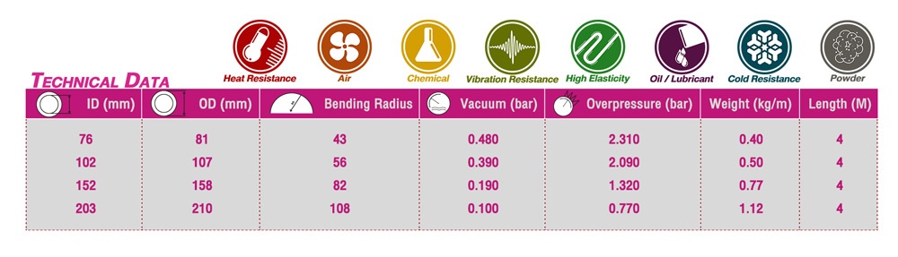 Spiral : spring steel wire hidden between the 2 layers. high-temperature glass fiber cord on the outer surface.